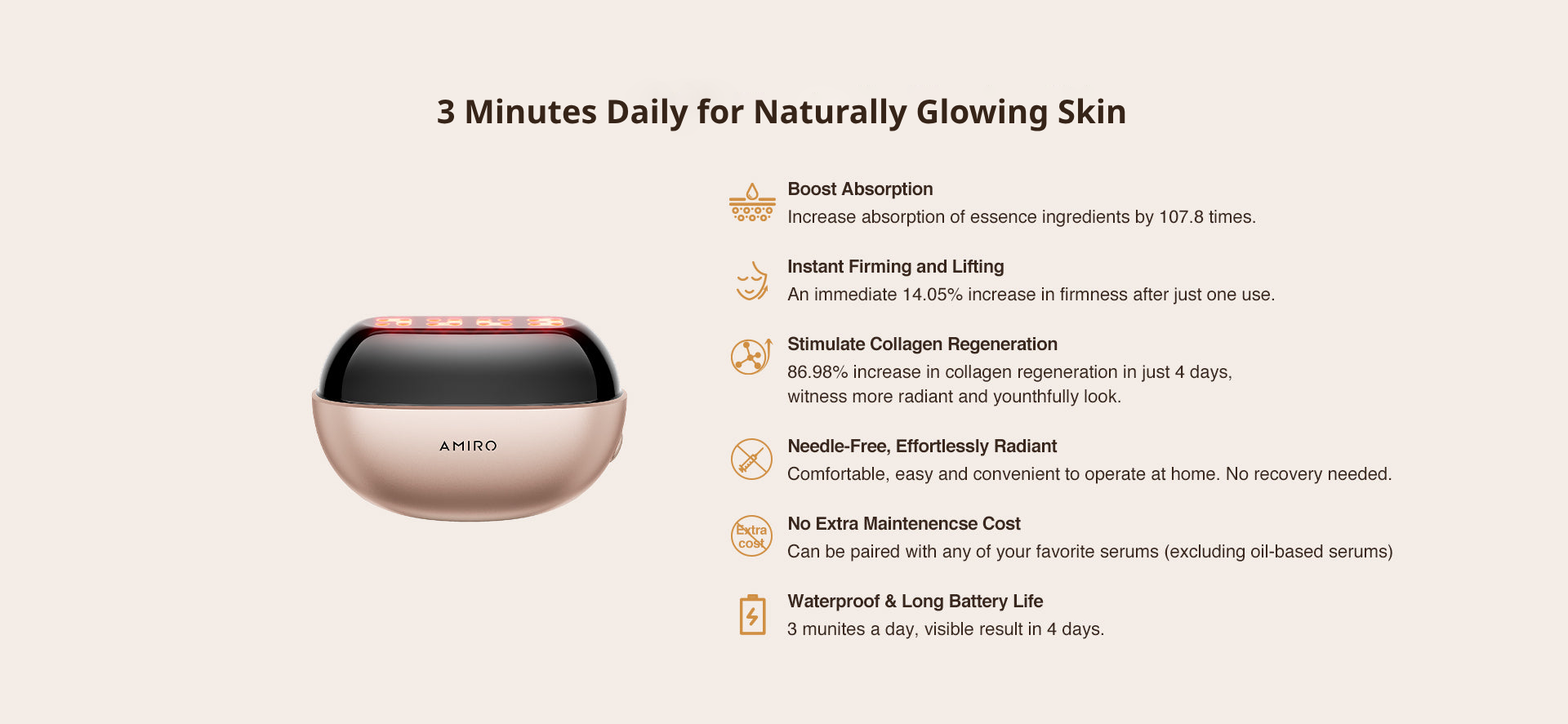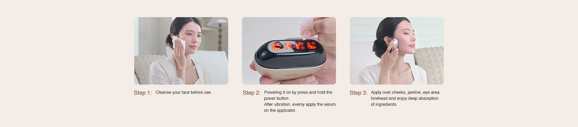 Powered by a triple-threat of advanced technologies—Light Theraphy, Thermal-Electric Theraphy, and Squarewave Microcurrent—this revolutionary formula tightens, brightens, and rejuvenates your skin in just 3 minutes.