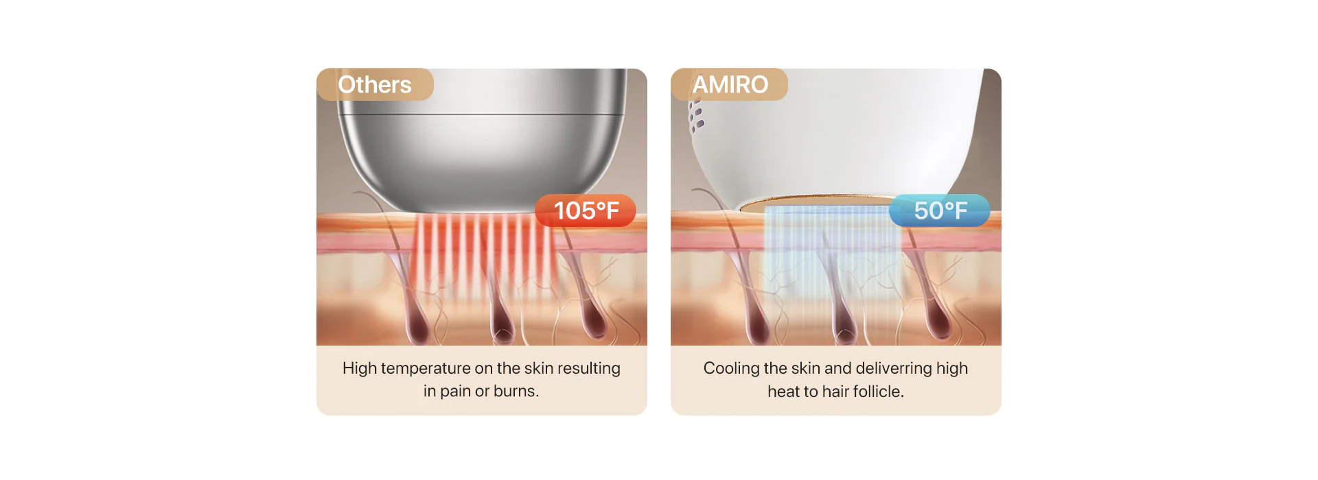 Implementing Amiro facial device technology, enjoy a 360° full ice compress experience whilst doing hair removal. Painless and skin-friendly, and the special ice-cooling model helps you to tighten your skin after hair removal, avoiding the possibility of coarse hair follicles.