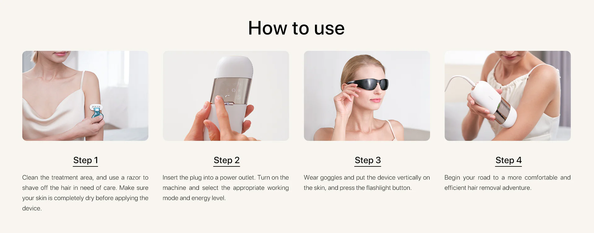 Achieving smooth and hair-free skin in the comfort of your own home. Our device utilizes Intense Pulsed Light (IPL) technology, Our technology allows you to remove hair faster, safer, and liberating your hands. Our hands-free sliding mode carries stronger light beam energy straight to every hair follicle. Enjoy a quick full-body hair removal session before you even know it!!