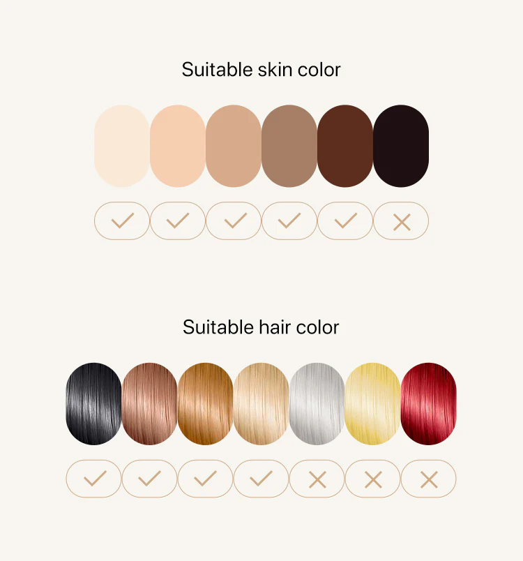 It is important to note that IPL is most effective on individuals with lighter skin tones and darker hair colors. This is because the light energy is primarily absorbed by the melanin pigment in the hair. In individuals with darker skin tones, the excess melanin in the skin can also absorb light energy, leading to potential skin damage.Similarly, IPL may not be as effective on individuals with light hair colors such as blonde, gray, or red. This is because these hair colors have less melanin content, making it challenging for the IPL device to target the hair follicles effectively.To ensure the effectiveness and safety of IPL hair removal, we recommend users to refer to the provided skin tone chart before making a purchase.