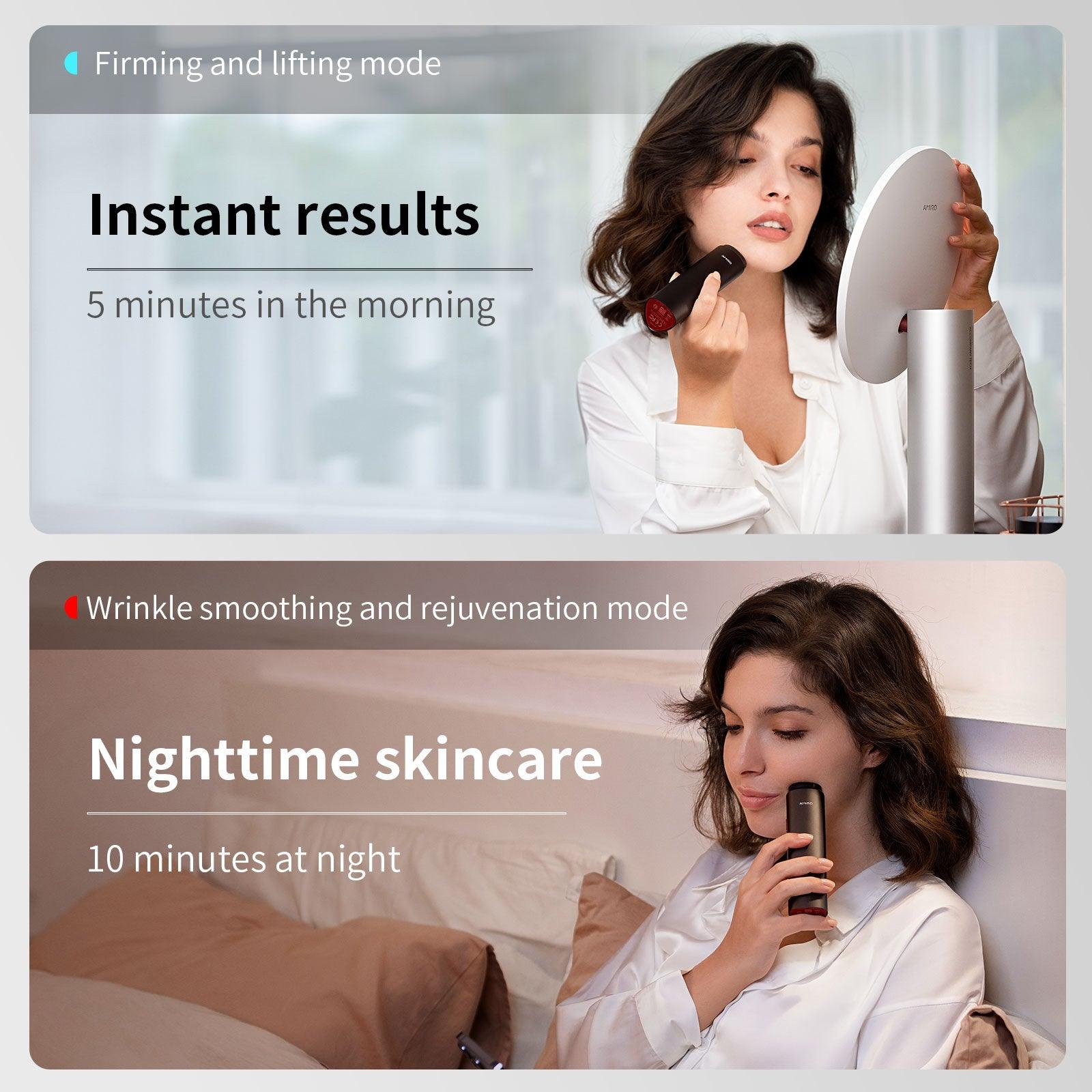 Use RF+Red light+Infrared light for 10 minutes at night to lift your face, reduce wrinkles, and boost collagen production before bedtime.