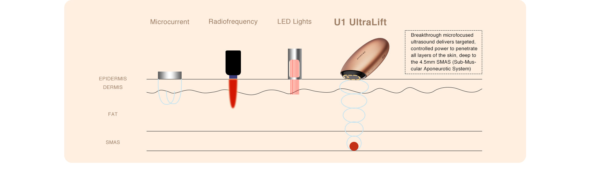 Since U1 UltraLift delivers the most noticeable and long-lasting lifting effects, its powerful energy penetrates the skin's SMAS layer up to 4.5 millimeters, requiring your special attention during use: