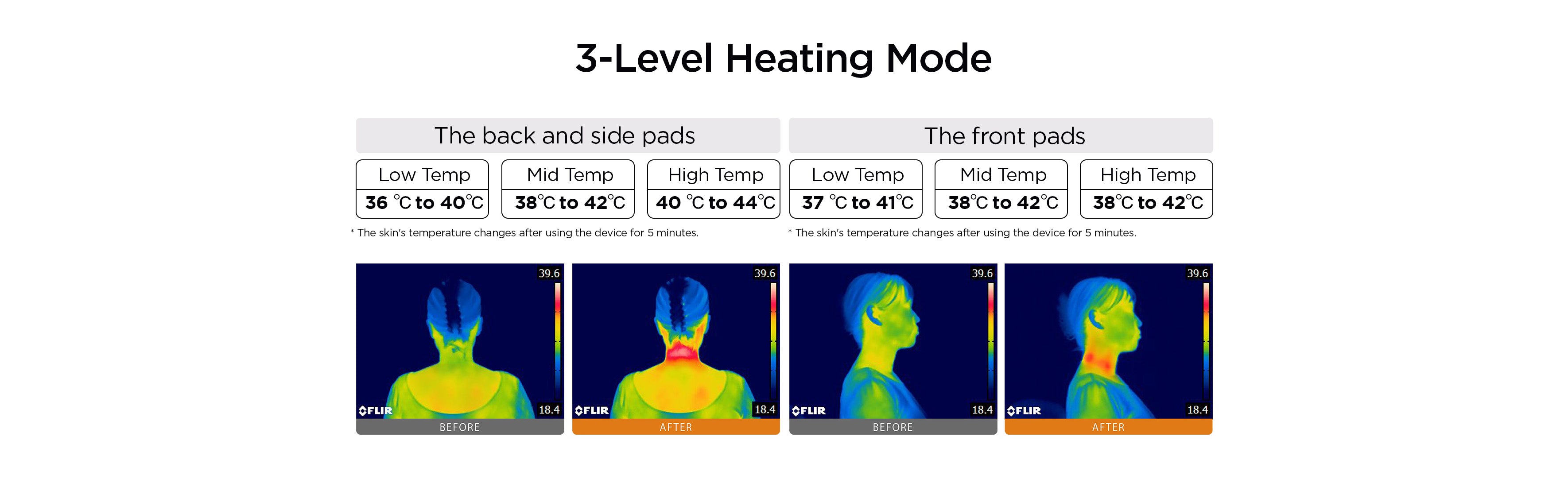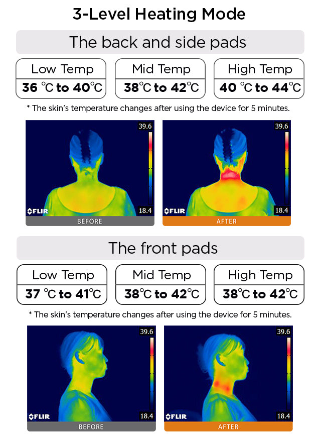 Equipped with a dual-control system, the DR. HEAT NECK allows you to customize the EMS massage modes and heat modes of the back & side pads and the front pads separately.