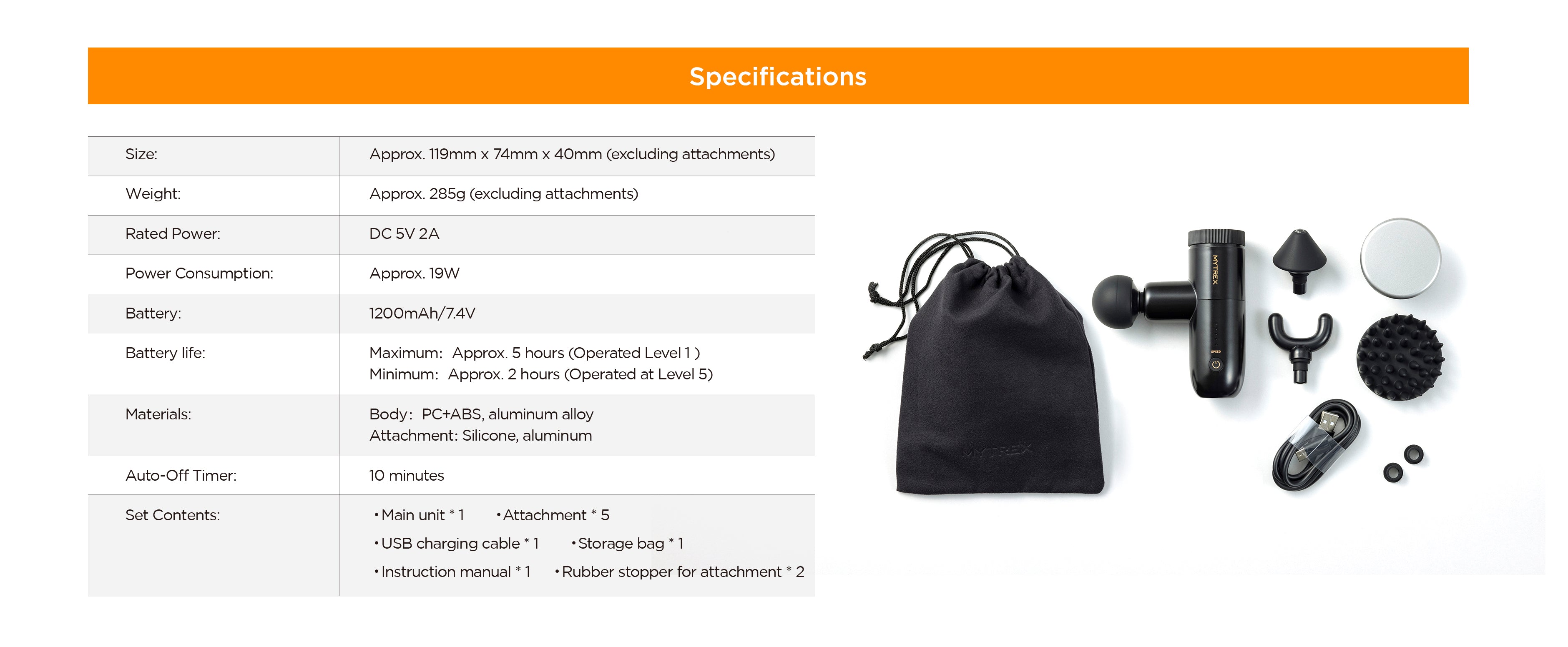 | Set contents | ・Main unit x 1 ・Attachments x 5 |